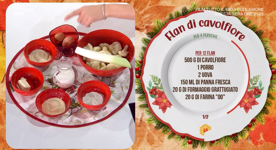 flan di cavolfiore di Francesca MarsettiUna ricetta ‘un po’ leggera’ e un po’ no, quella di Francesca Marsetti, che sotto l’occhio vigile di Evelina prepara un piatto a base di verdure, concedendosi qualche sgarro. Ecco il flan di cavolfiore.