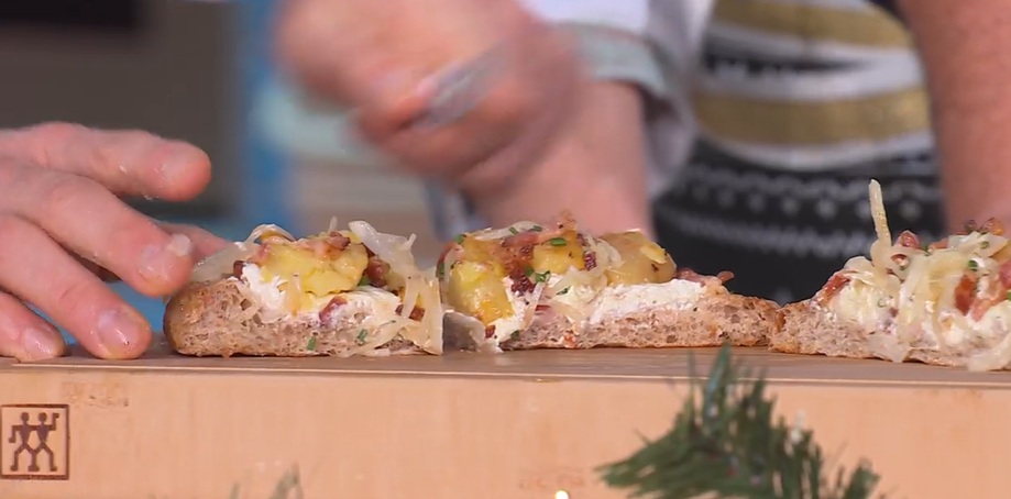 - 100 g creme fraiche, 100 g quark, pancetta, patate bollite, cipolle stufate, erba cipollina