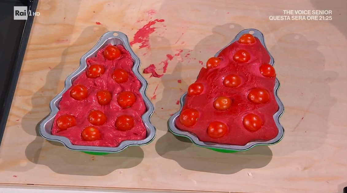 Prendiamo degli stampi a forma di albero di Natale e disponiamo sul fondo dei pomodori tagliati a metà. Copriamo con l’impasto lievitato, che prima stendiamo sul piano con le mani, ed inseriamo in superficie ancora dei pomodorini tagliati a metà. Copriamo e lasciamo lievitare per 1 ora a temperatura ambiente.
