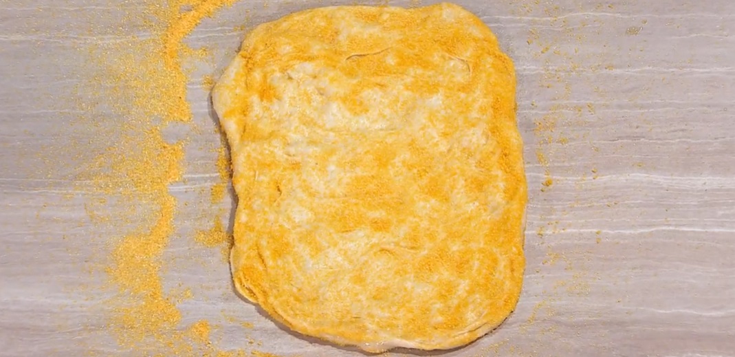 Ungiamo ciascuna teglia con abbondante olio, rotoliamo il filoncino nell’olio, quindi lo passiamo subito nella farina di mais e lo allarghiamo con le mani, fino ad ottenere uno spessore di mezzo cm.