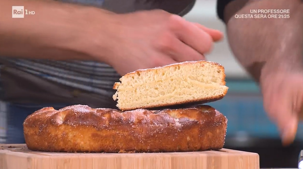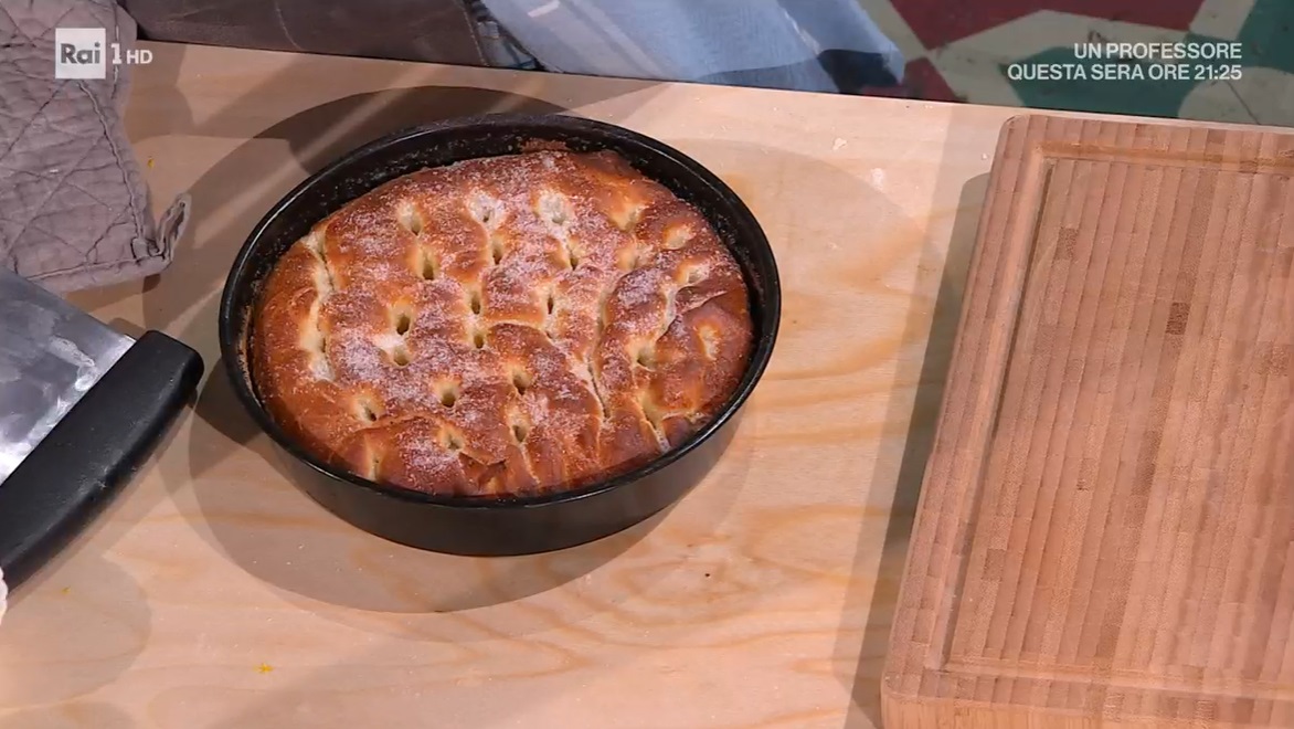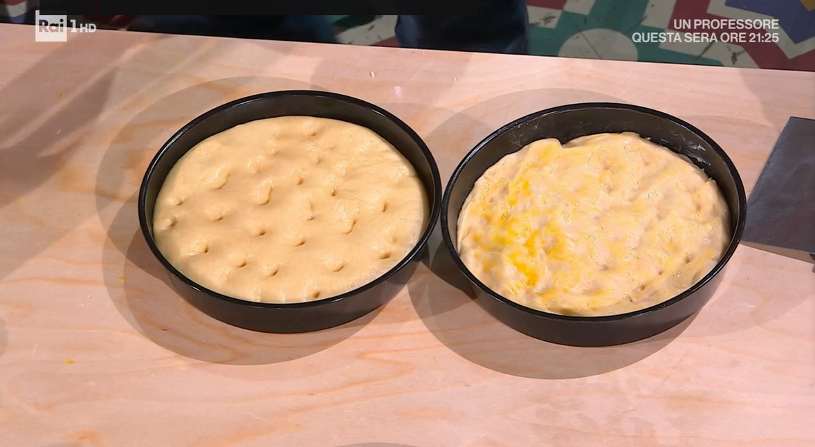 Dividiamo l’impasto in due parti uguali, a cui diamo la forma di sfere lisce, ripiegandole su loro stesse. Le posizioniamo all’interno di due tortiere ben imburrate. Copriamo con la pellicola e lasciamo rilassare per mezz’ora. Allarghiamo con le mani all’interno della teglia fino ad arrivare ai bordi, spennelliamo con l’uovo sbattuto, copriamo e lasciamo lievitare per 2 ore e mezza a temperatura ambiente.