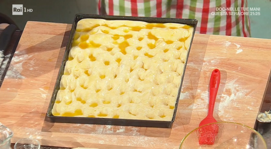 Trasferiamo l’impasto lievitato all’interno di una teglia (la placca del forno) ben unta d’olio. Lo allarghiamo con le mani fino ai bordi della teglia. Copriamo e lasciamo lievitare ancora 45 minuti.
