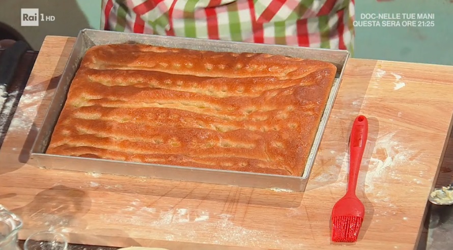 Per la salamoia, in una ciotola, mescoliamo con una frusta o una forchetta, l’acqua, l’olio e lo zucchero. Versiamo la salamoia sulla focaccia lievitata e premiamo nuovamente con le mani, in modo da creare le fossette. Cuociamo in forno preriscaldato e statico a 230° per 18-20 minuti.