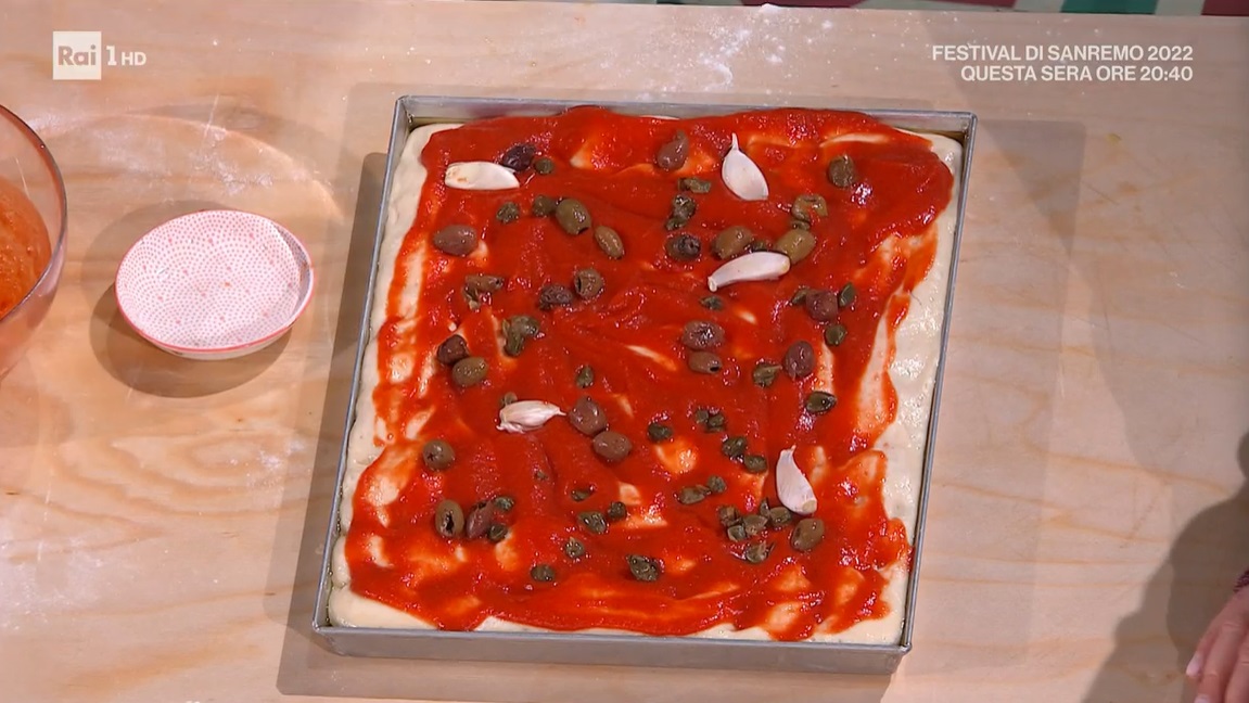 Ungiamo con abbondante olio le teglie. In ciascuna, inseriamo un panetto lievitato. Allarghiamo con le dita, senza arrivare ai bordi. Copriamo e lasciamo riposare 10 minuti. Allarghiamo ancora con le dita fino ai bordi della teglia, copriamo e lasciamo riposare per 30 minuti. Condiamo la focaccia con la passata di pomodoro, le olive denocciolate, 4-5 spicchi d’aglio interi e in camicia, i filetti di acciughe (possiamo metterle dopo la cottura) ed i capperi. Cuociamo in forno caldo e statico a 250° per 15 minuti, in posizione intermedia.