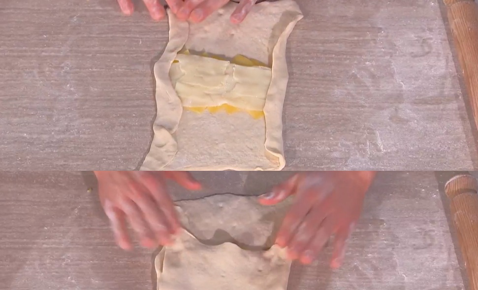 Dividiamo l’impasto in 4 parti uguali. Stendiamo un panetto con il mattarello, in modo da creare un quadrato sottilissimo. Disponiamo sopra il formaggio a fette, lasciando l’impasto 1 cm dai bordi. Ripieghiamo quest’ultimo centimetro verso il centro, quindi ripieghiamo a portafoglio.