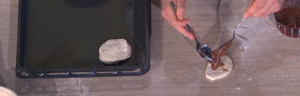 Su un dischetto, mettiamo un cucchiaio di crema spalmabile alle nocciole. Copriamo con un altro dischetto, premendo leggermente sui bordi. Le disponiamo su una teglia, le copriamo e le lasciamo lievitare ancora 45 minuti al caldo.