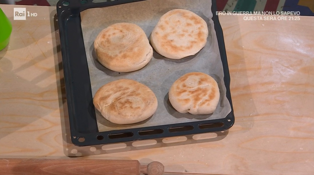 Con il mattarello, quindi, stendiamo ogni chiocciola, in modo da ottenere dei dischi alti circa 1-2 cm. Li cuociamo in forno caldo e statico a 250° per 6 minuti.