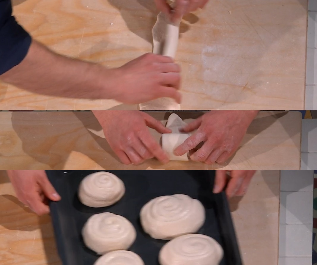Con il mattarello, assottigliamo ogni striscia, in modo da creare una lingua di pasta sottile. Ripieghiamo a metà, per il lungo, quindi arrotoliamo la lingua su se stessa, in modo da ottenere una chiocciola. Copriamo con della carta assorbente bagnata e lasciamo lievitare per 30 minuti.