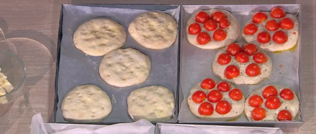 Allarghiamo ogni pallina direttamente sulla teglia, con le mani, rendendole sottili anche sui bordi. Su una metà inseriamo i pomodorini Pachino tagliati a metà; sull’altra metà distribuiamo semplicemente dello zucchero semolato. Copriamo e lasciamo lievitare ancora 1 ora. Finiamo di condire le salate con origano, sale e olio; le dolci con fiocchi di burro.