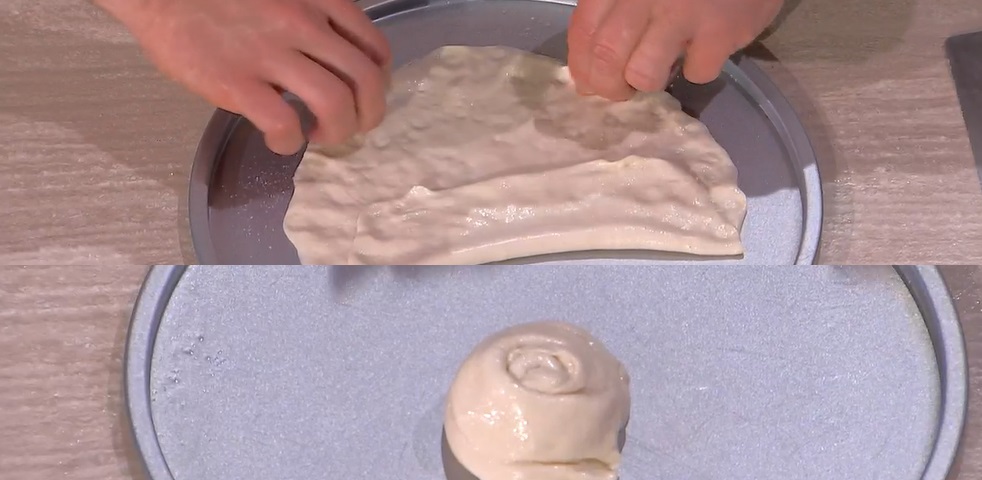 Bagniamo ogni pallina con abbondante olio di semi, quindi la appiattiamo su una teglia ben oliata, con le mani, fino a renderla sottilissima. Spolveriamo con poco sale fino, quindi ripieghiamo i lembi esterni verso il centro e successivamente ed arrotoliamo, formando un salsicciotto. Schiacciamo quest’ultimo su un lato, formando come una rosetta. Copriamo e lasciamo riposare ancora 20 minuti.