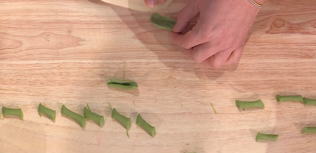 Con l’impasto, formiamo dei serpentelli, che tagliamo a tocchetti lunghi circa 5 cm. Con un tarocco, ‘trasciniamo’ ogni gnocchetto sul piano, in modo da assottigliarlo e formare la foglia d’ulivo: sono simili agli strascinati o orecchiette pugliesi. Lessiamo in acqua bollente e salata per circa 5 minuti.