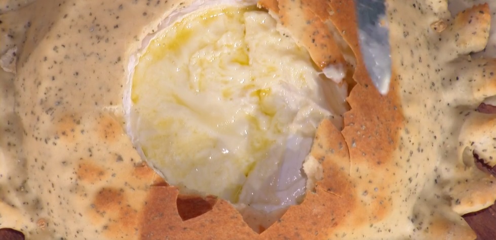 Al centro di un disco mettiamo una forma intera di formaggio briè. Copriamo con l’altro disco di impasto, chiudiamo bene i bordi con una rotella, eliminando la parte in eccesso, che usiamo per fare dei decori a piacere. Spennelliamo con un albume. Inforniamo a 210⁰ per 15 minuti.