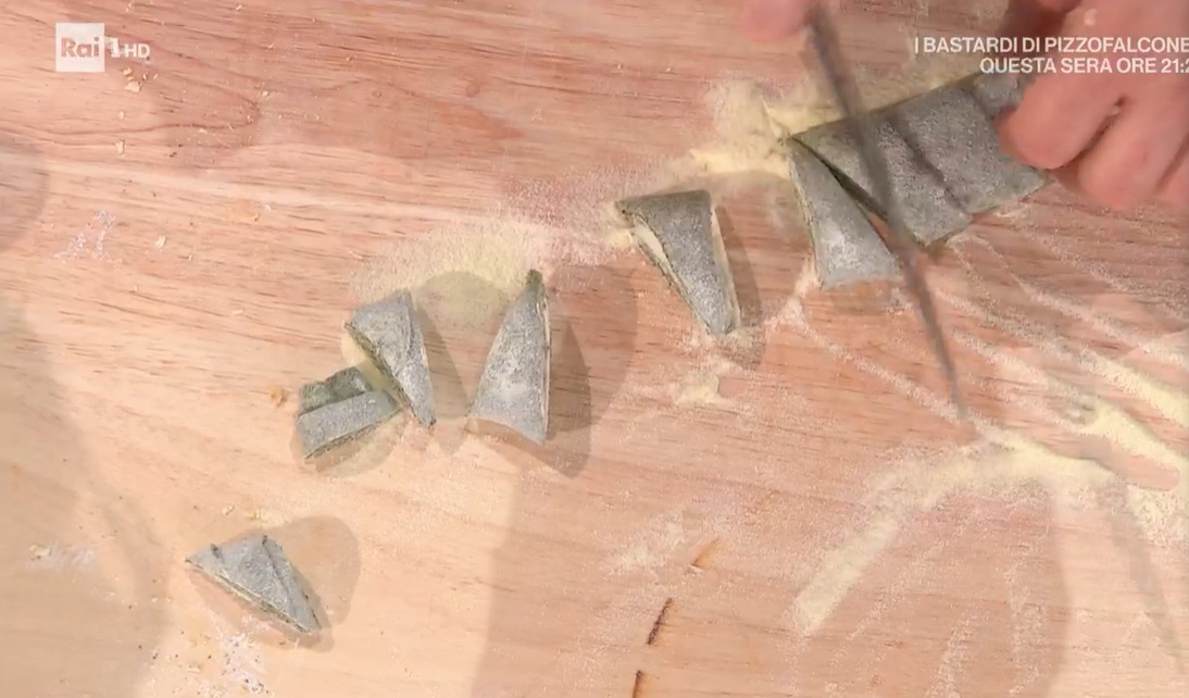 Prepariamo la pasta: lavoriamo la farina con le uova intere, il prezzemolo essiccato ed in polvere ed un pizzico di peperoncino in polvere (possiamo evitare prezzemolo e peperoncino). Ottenuto un panetto omogeneo, lo avvolgiamo nella pellicola e lasciamo riposare per almeno mezz’ora. Tiriamo la sfoglia non troppo sottile e lasciamo asciugare qualche minuto all’aria. Arrotoliamo la striscia di sfoglia su se stessa e tagliamo il rotolo ottenuto a triangoli (foto). Srotoliamo e lessiamo la pasta in acqua bollente e salata per un paio di minuti.