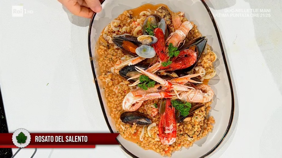 In una padella rosoliamo un goccio di olio con uno spicchio d’aglio e poi uniamo le seppie, i calamari tagliati a listarelle,peperoncino, prezzemolo e cipollotto tritati. Sfumiamo con il vino bianco, uniamo i pomodori pelati. Lasciamo cuocere per 5 minuti. Infine mettiamo la fregula, cozze e vongole, copriamo con brodo di crostacei e facciamo cuocere per 14 minuti.