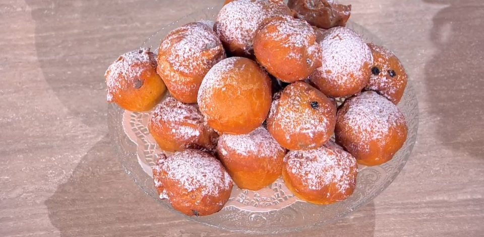 - 500 g farina 0, 7 g lievito di birra fresco, 220 ml latte, 50 g zucchero, 1 uovo, 10 g sale, 50 g olio di semi, 80 g uvetta, scorza di 1 limone, olio di semi per friggere
