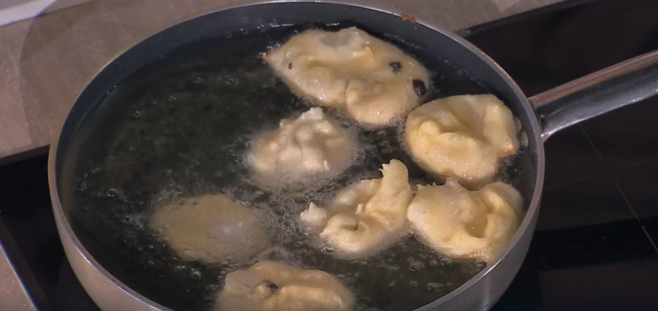 Scaldiamo abbondante olio, profondo, in un pentolino, quindi tuffiamo delle belle noci di impasto (che preleviamo con le mani unte): le lasciamo friggere fino a doratura, rigirandole. L’olio non dev’essere troppo caldo, o rischiano di rimanere crude al cuore.