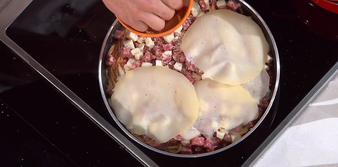 Scaldiamo una padella con un generoso filo d’olio. Disponiamo sopra metà degli spaghetti conditi con sugo e uova. Distribuiamo sopra salame e mozzarella a dadini, caciocavallo a fette e parmigiano grattugiato. Copriamo con la pasta tenuta da parte e mettiamo il coperchio. Lasciamo cuocere, prima su un lato, poi la rigiriamo.