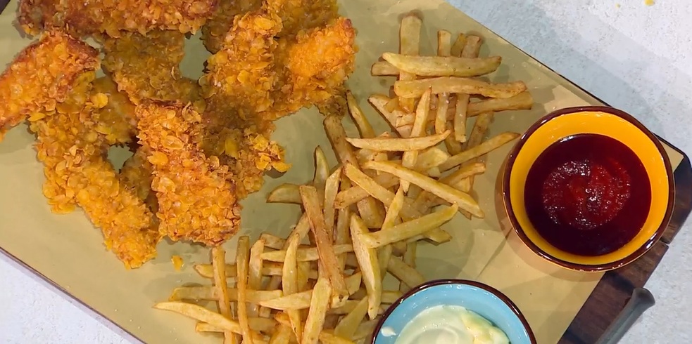 Prendiamo il pollo, lo passiamo in un misto di farina e paprica, poi nelle uova sbattute con una presa di sale e, infine, nei corn flakes sbriciolati: premiamo bene in modo da farli aderire. Friggiamo il pollo panato in olio caldo a 160° e profondo, fino a doratura.