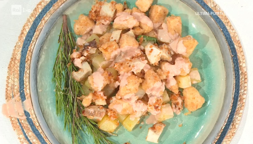 Serviamo il fritto con le patate spadellate e la salsa ormai fredda.