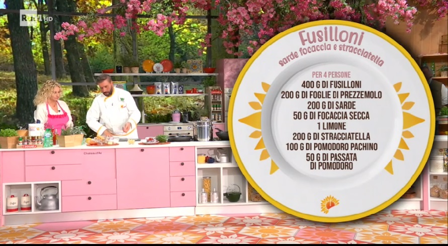 - 400 g fusilloni, 200 g foglie di prezzemolo, 200 g sarde, 50 g focaccia secca, 1 limone, 200 g stracciatella, 100 g pmodoro pachino, 50 g passata di pomodoro