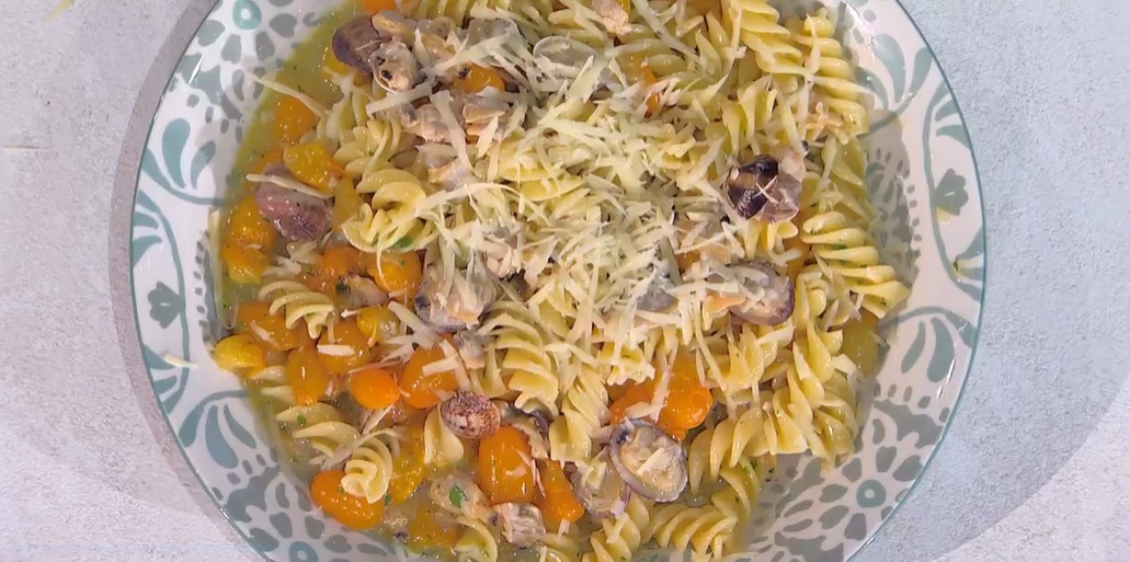 Nel ricchissimo menu di oggi c’è anche il piatto di Antonio Paolino. Il cuoco campano, che condisce ogni sua ricetta con una bella canzone, oggi prepara un primo piatto di mare, i fusilloni estivi.