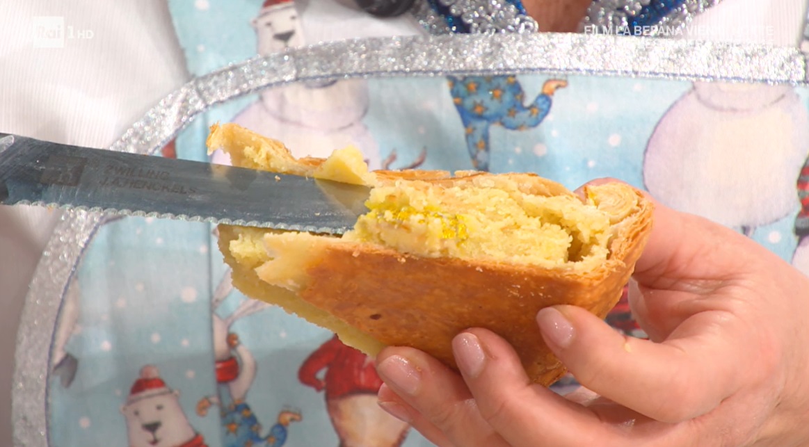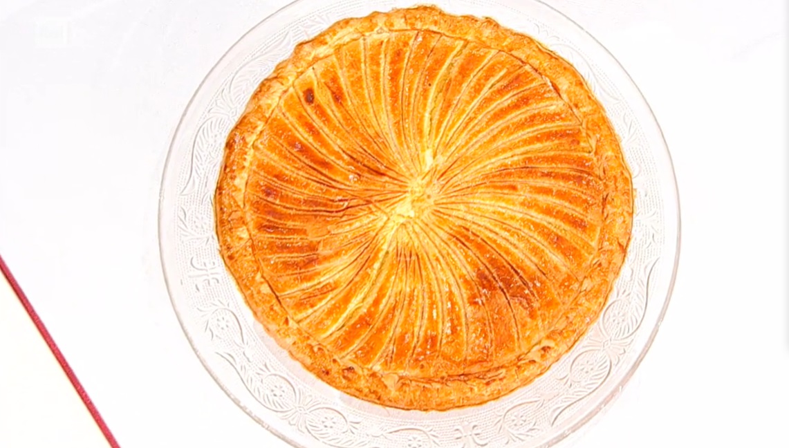 Prendiamo il primo disco di sfoglia e lo srotoliamo sulla teglia. Stendiamo sullo stesso la crema preparata, lasciando liberi 2 cm dal bordo. Inseriamo la sorpresa, ovvero un confetto dorato, in un punto e spennelliamo i bordi con il tuorlo sbattuto. Copriamo con l’altro disco di sfoglia, sigillando bene il bordo esterno e decoriamo la galette con un coltello affilato senza però incidere completamente la pasta sfoglia. Spennelliamo con il tuorlo battuto e con pochissima acqua, e cuociamo in forno già caldo a 180° C per circa 40 minuti.