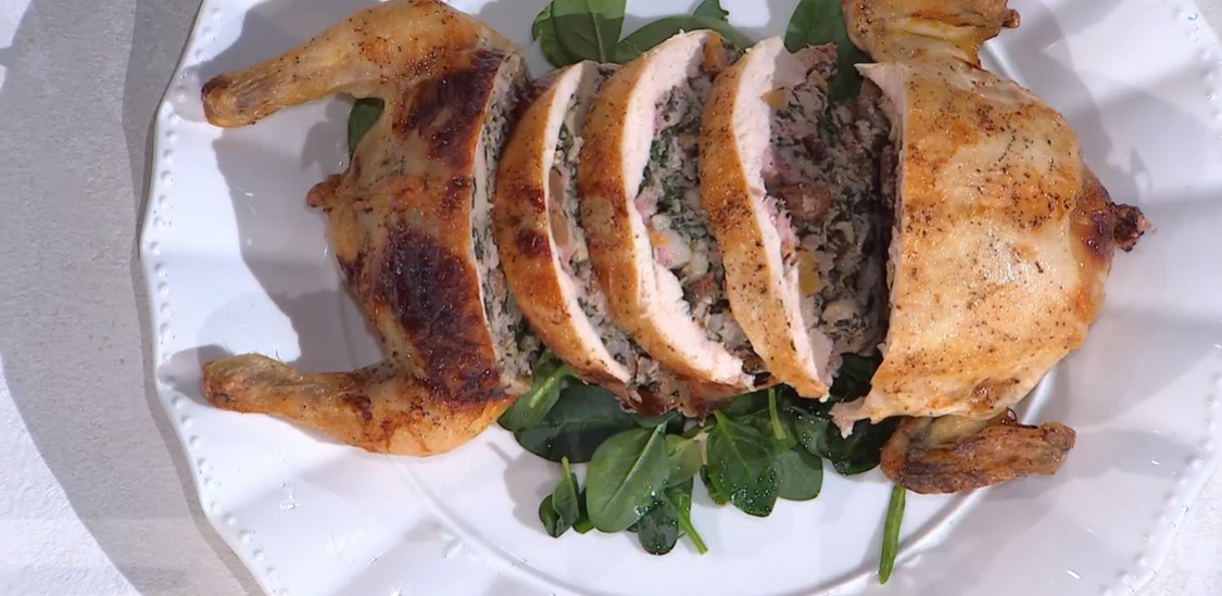 Disossiamo il galletto, lo apriamo e lo condiamo con sale e pepe. Mettiamo al centro la farcitura e ricuciamo il galletto sul ripieno, ricomponendolo. Lo posizioniamo su una teglia, spennelliamo con il burro e cuociamo in forno caldo e statico a 180° per 60 minuti.