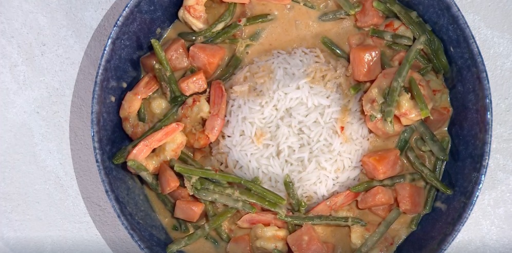 • 15 code di gambero, 200 g fagiolini, 1 patata dolce, 400 ml latte di cocco, 20 g pasta di curry, 20 g concentrato di pomodoro, 1 scalogno, 1 spicchio d’aglio, 15 g amido di riso, zenzero, galanga, coriandolo, olio, sale