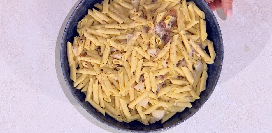 Ad accogliere il simpaticissimo chef Cannavacciuolo, oggi, c’è anche una scatenata zia Cri. La cuoca romagnola prepara un primo piatto veloce, da proporre all’ultimo minuto. Ecco i garganelli con prosciutto pecorino e pere.