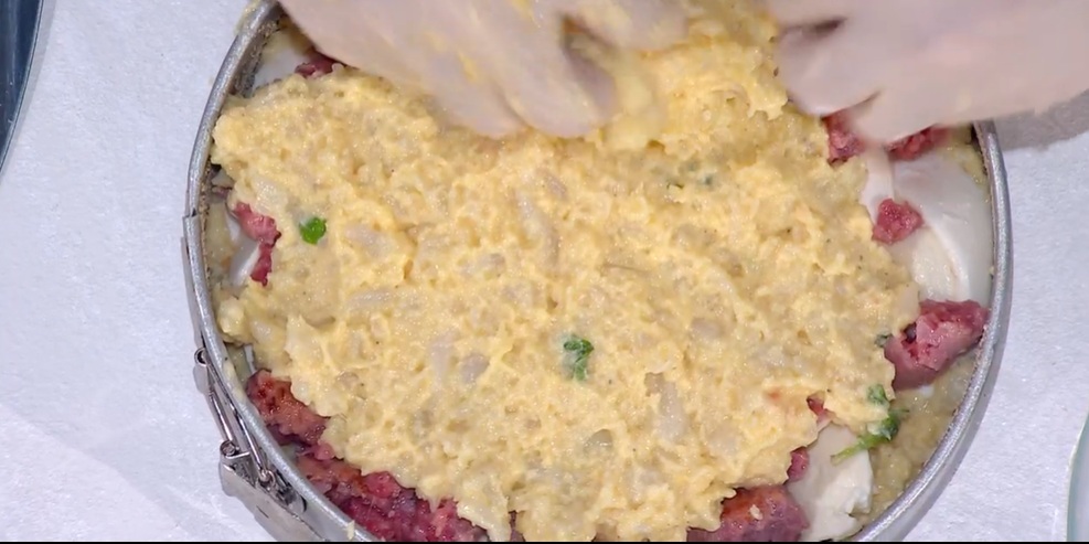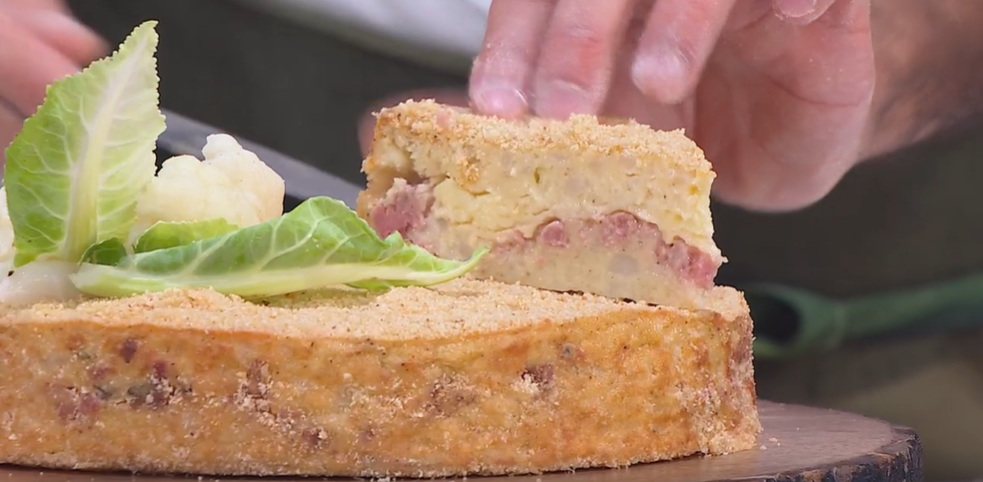 Imburriamo una tortiera e la spolveriamo con il pangrattato. Distribuiamo alla base metà dell’impasto di cavolfiore. Mettiamo sopra la mozzarella a fette (o altri formaggi o salumi) e la salsiccia rosolata, quindi copriamo con l’impasto rimasto. Livelliamo, spolveriamo con pangrattato e cuociamo in forno caldo a 175° per 35-40 minuti.