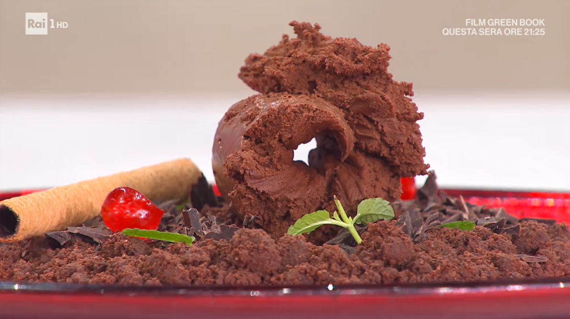 Massimiliano lo serve in questo modo: distribuisce sul piatto dei frollini al cioccolato sbriciolati grossolanamente, della polvere di caffè, delle foglie di menta e del cioccolato fondente tritato. Adagiamo sopra una sfera di gelato.