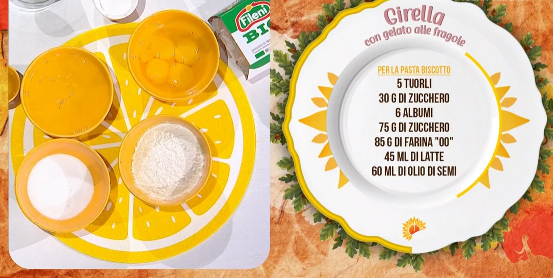• 5 tuorli, 30 g zucchero, 6 albumi, 75 g zucchero, 85 g farina 00, 45 ml latte, 60 ml olio di semi