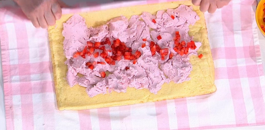 Srotoliamo il pan di Spagna e spalmiamo sopra il girella con gelato alle fragole morbido, un po’ di fragole a dadini e arrotoliamo nuovamente il pan di Spagna sul ripieno, dal lato lungo, ben stretto. Rimettiamo in freezer per qualche ora. Tagliamo a fette e serviamo con panna montata e fragole fresche.