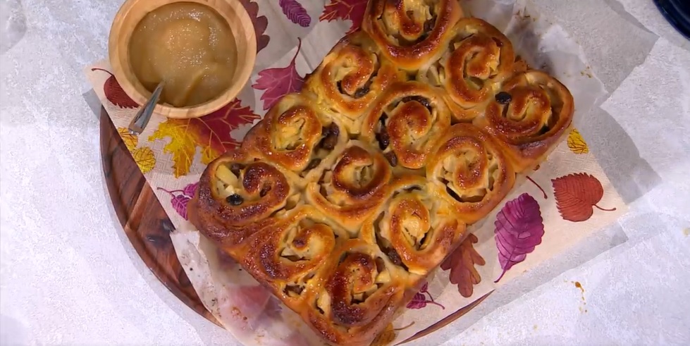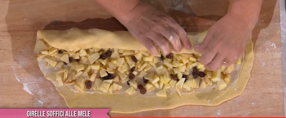 Stendiamo l’impasto con il mattarello, in modo da ottenere un rettangolo spesso circa 1 cm (circa 20×50 cm). Spalmiamo sopra la crema di burro preparata, quindi distribuiamo sopra le mele. Arrotoliamo l’impasto sul ripieno, partendo dal lato lungo. Tagliamo il rotolone ottenuto in 6 fette uguali. Disponiamo le fette su una teglia con carta forno, rivolgendo il taglio verso l’alto. Spennelliamo con l’uovo sbattuto, copriamo e lasciamo lievitare ancora una mezz’ora. Cuociamo in forno caldo e statico a 180° per 20 minuti.