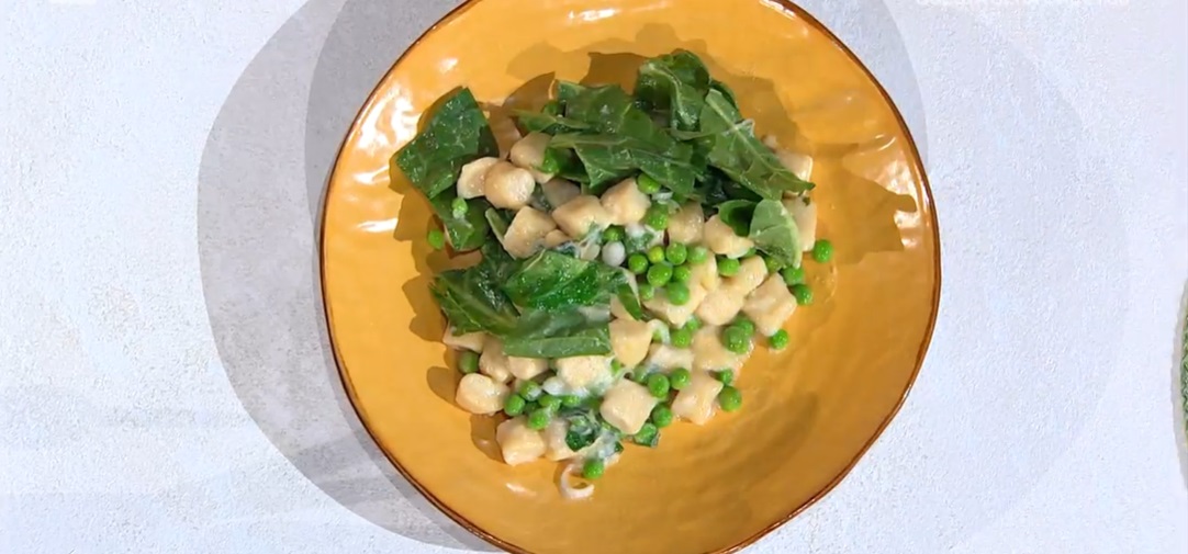 Per il condimento, in padella, facciamo rosolare il cipollotto tritato con una noce di burro ed un filo d’olio. Uniamo i piselli freschi e lasciamo insaporire qualche minuto. Aggiungiamo le bietole fresche (o spinaci) tagliate a pezzettoni con il coltello.