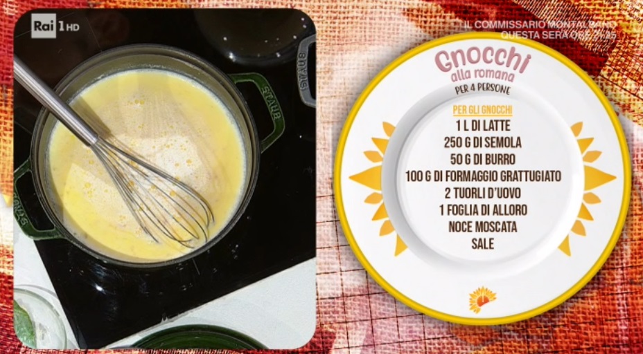 - 1 l latte, 250 g semola, 50 g burro, 100 g formaggio grattugiato, 2 tuorli d’uovo, 1 foglia di alloro, noce moscata, sale