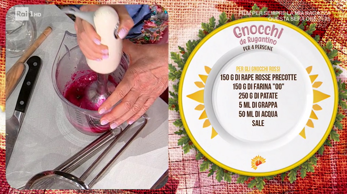 - Gnocchi rossi: 150 g rape rosse precotte, 150 g farina 00, 250 g patate, 5 ml grappa, 50 ml acqua, sale