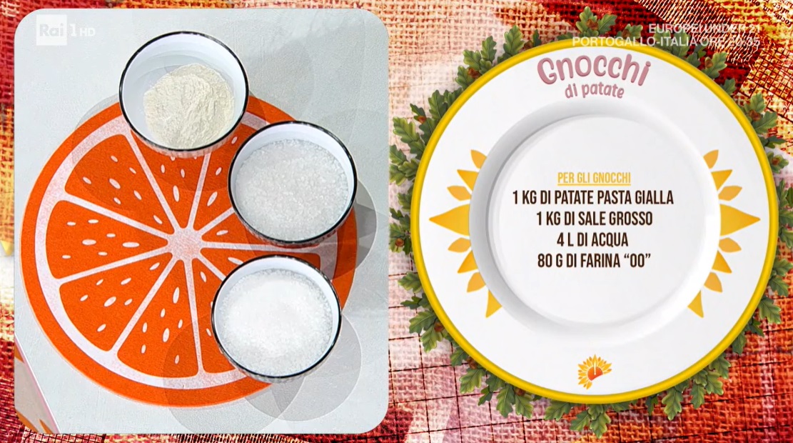 - 1 kg patate pasta gialla, 1 kg sale grosso, 4 l acqua, 80 g farina 00 (o 50 g di amido di mais, per la versione senza glutine)
