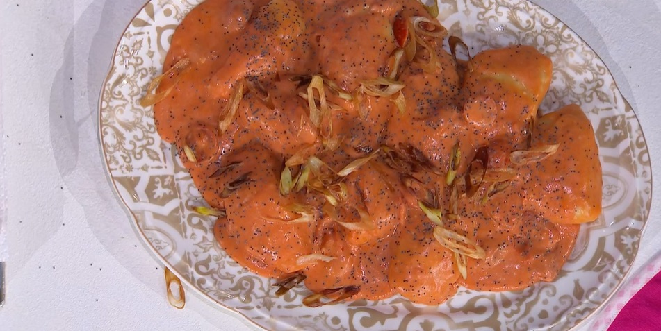 Stendiamo l’impasto di patate con il mattarello ad uno spessore di mezzo cm circa. Ritagliamo dei dischetti e, su ognuno, mettiamo una noce di ripieno. Richiudiamo a mezzaluna e mettiamo a cuocere gli gnocchi in acqua bollente e salata (per circa 3 minuti). Li scoliamo e li saltiamo in padella con la salsa Aurora (pomodoro e besciamella). Serviamo con sopra il porro fritto ed i semi di papavero.
