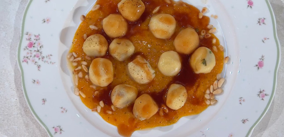 Per gli gnocchi, in una ciotola, mettiamo la ricotta ben scolata, il formaggio grattugiato, gli amidi (o farina 00), le uova intere, sale, pepe e lavoriamo fino ad ottenere un composto omogeneo. Ricaviamo delle noci di impasto e, con un dito, schiacciamo al centro, formando un incavo. Farciamo quest’ultimo con il ripieno di carne. Richiudiamo l’impasto sul ripieno, arrotondando gli gnocchi. Li cuociamo in acqua calda e bollente e, quando vengono a galla, li scoliamo e li ripassiamo in padella con una noce di burro, un mestolino di acqua di cottura, timo e pinoli tostati. Serviamo su un letto di crema di zucca.
