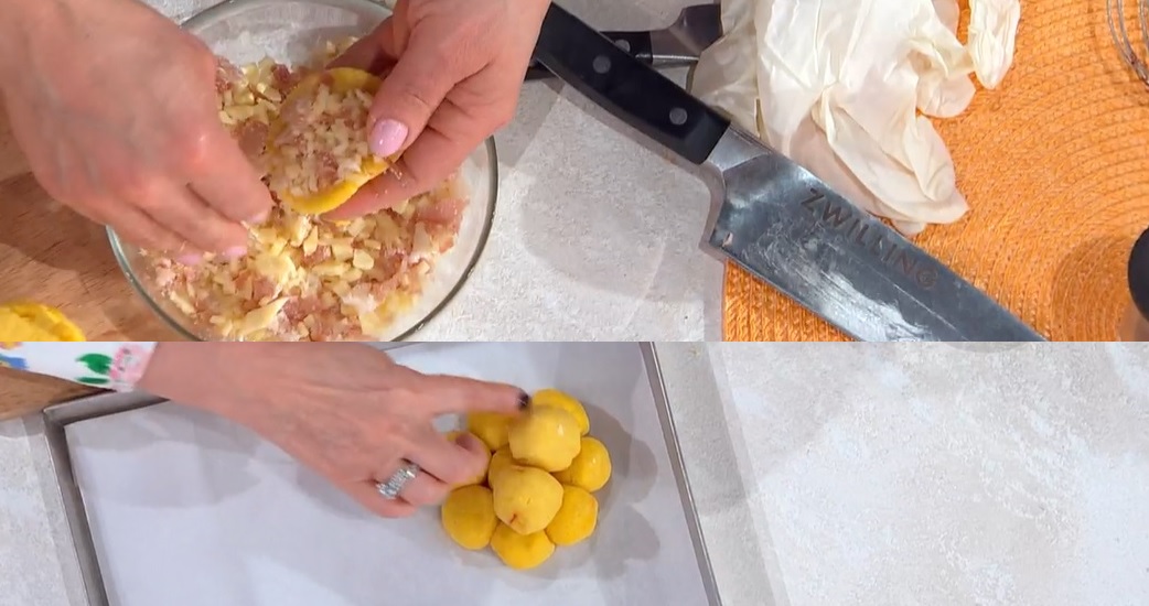 Dividiamo l’impasto degli gnocchi in 4 panetti, formiamo con ognuno dei serpentelli spessi, che tagliamo a tocchetti. Appiattiamo ciascuno, in modo da ottenere dei dischetti. Mettiamo al centro di ognuno abbondante ripieno, quindi richiudiamo a formare una pallina liscia. Posizioniamo le palline su una teglia con carta forno, a formare dei rametti di mimosa. Spennelliamo quest’ultimi con del burro fuso e spolveriamo con formaggio grattugiato. Cuociamo in forno caldo e statico a 200° per 15 minuti. Serviamo con degli spinacini crudi a striscioline.