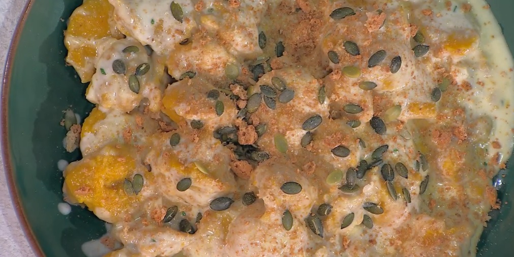 Portiamo a bollore una pentola d’acqua salata e tuffiamo all’interno delle quenelle di impasto, aiutandoci con due cucchiaini. Facciamo bollire per 1 minuto da quando vengono a galla. Scoliamo e serviamo con sopra la fonduta di formaggio, gli amaretti sbriciolati, del rosmarino tritato ed i semi di zucca tostati.