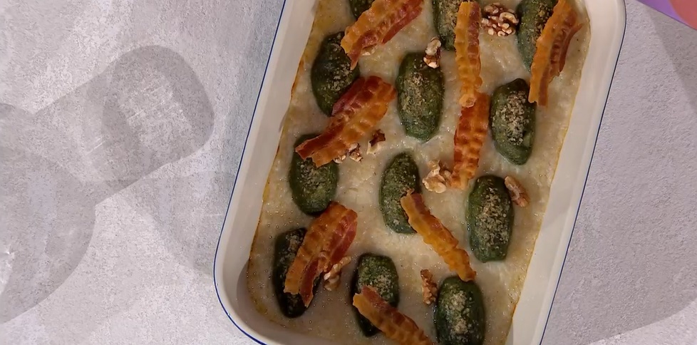 Li serviamo con sopra della pancetta essiccata e noci sbriciolate.
