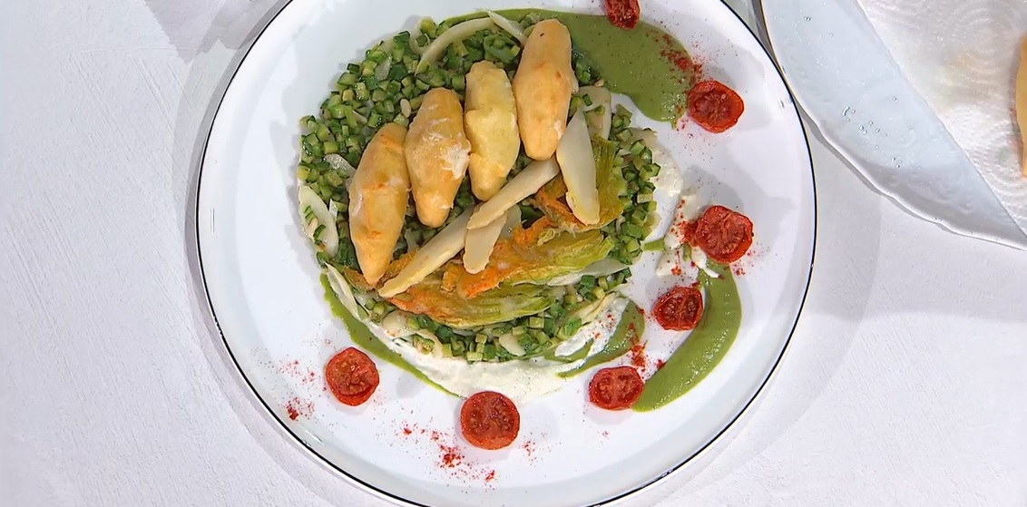 Sul piatto, spalmiamo un po’ di crema di zucchine ed un po’ di crema di burrata. Distribuiamo sopra le verdure croccanti e posizioniamo sopra gli gnocchi fritti. Finiamo con i pomodorini confit e la polvere di peperone.