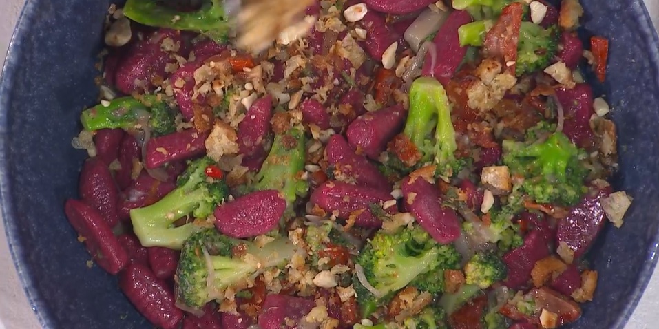 Gnocchi: nel mixer, frulliamo la barbabietola precotta insieme all’uovo, sale e pepe. In una ciotola, mettiamo la farina 00, il composto alla barbabietola ed impastiamo fino ad ottenere un panetto omogeneo.