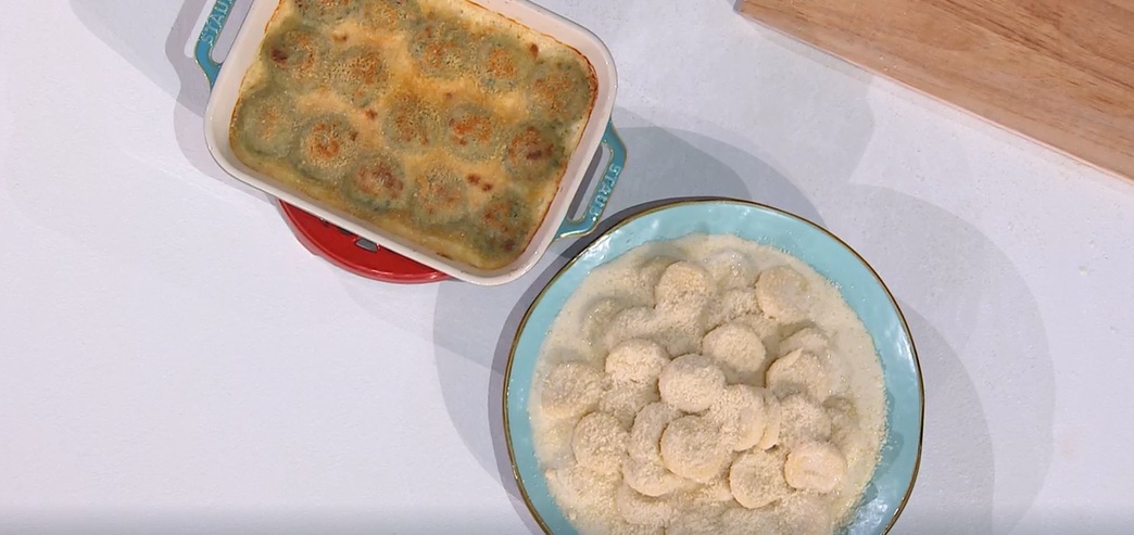 Mettiamo gli gnocchi verdi in una pirofila imburrata. Copriamo con la fonduta, spolveriamo con parmigiano grattugiato, pangrattato, fiocchi di burro e passiamo in forno caldo a 220° per 7-15 minuti: deve dorare.
