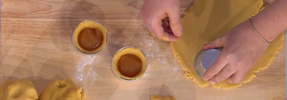 Stendiamo la frolla ad uno spessore di circa 3-4 mm. La usiamo per foderare il fondo ed i bordi di stampini monoporzione (quelli in alluminio), o una teglia da muffin. Farciamo con un bel cucchiaio (senza esagerare) di confettura di mele cotogne (o altra a scelta) e copriamo con un altro dischetto di frolla, sigillando bene i bordi.