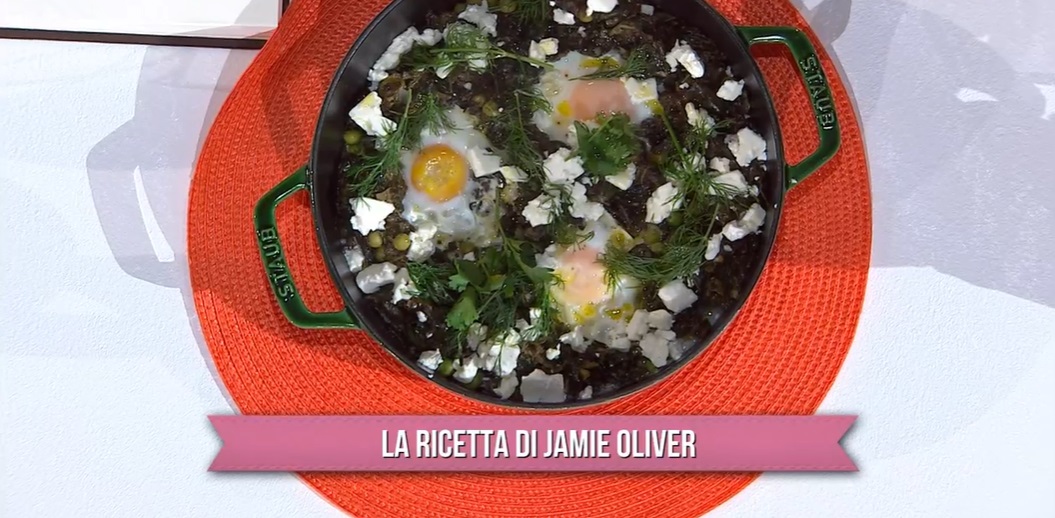 - 200 g spinaci lessi, 100 g cavolo nero, 50 g piselli, 3 uova, 2 cipollotti, aglio, mezzo limone, 50 g feta, menta, aneto, cumino, coriandolo, origano, olio, sale e pepe