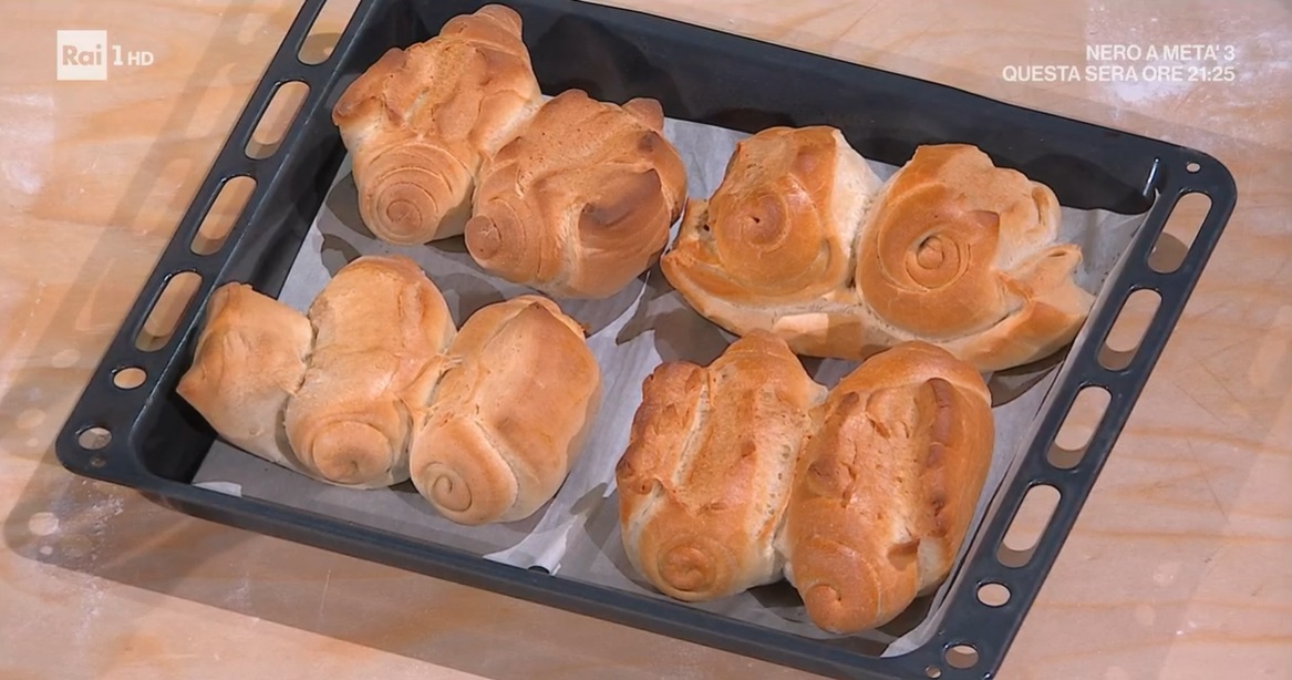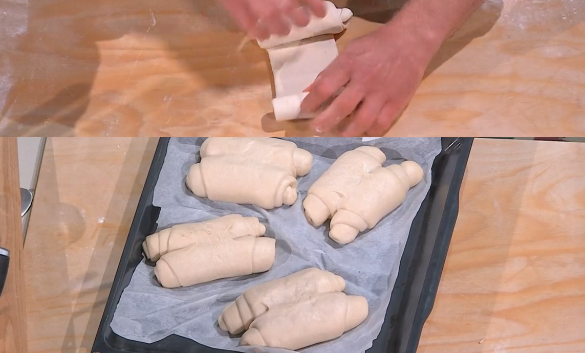 Con il mattarello, stendiamo ciascun panetto, dando la forma di una lingua sottile. Arrotoliamo la lingua su se stessa, partendo dai lati corti, da una parte e dell’altra, in modo da congiunge le due estremità verso il centro. Copriamo e lasciamo lievitare 1 ora e mezza a temperatura ambiente.