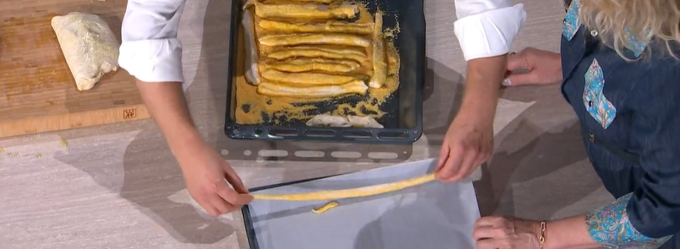 Ungiamo tutta la superficie dell’impasto lievitato con abbondante olio. Lo allarghiamo leggermente su un tagliate e lo tagliamo a fettine. Impaniamo ciascuna fettina nella farina di mais, quindi la allunghiamo, tirandola alle due estremità con le mani.